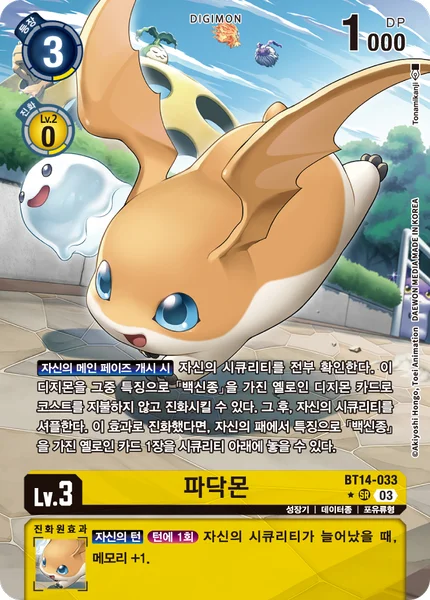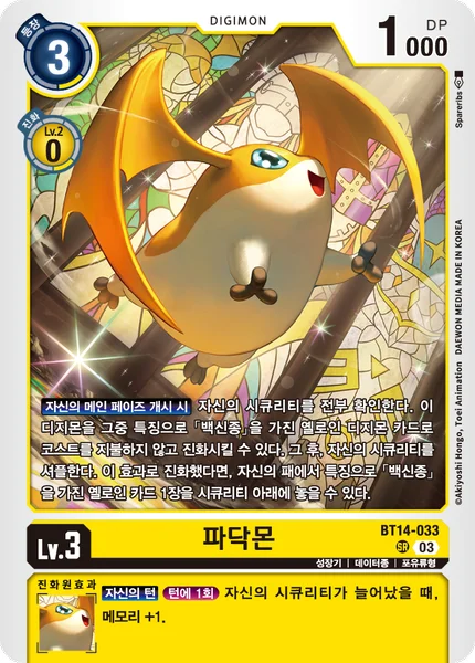 Start of Your Main Phase Search your security stack. This Digimon may digivolve into a yellow Digimon card with the [Vaccine] trait among them without paying the cost. Then, shuffle your security stack. If digivolved by this effect, you may place 1 yellow card with the [Vaccine] trait from your hand at the bottom of your security stack.