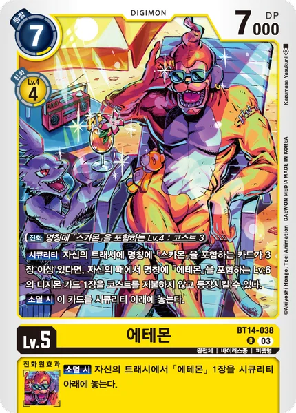 Security If you have 3 or more cards with [Sukamon] in their names in your trash, you may play 1 level 6 Digimon card with [Etemon] in its name from your hand without paying the cost.