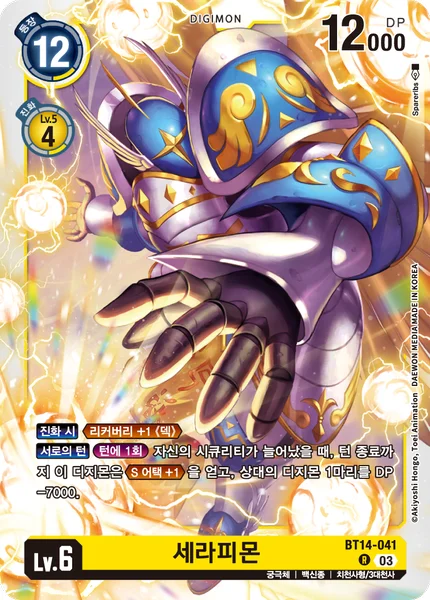 All TurnsOnce Per Turn When a card is added to your security stack, 1 of your opponent's Digimon gets -7000 DP and this Digimon gains Security A. +1 for the turn.