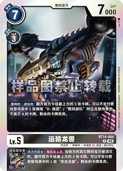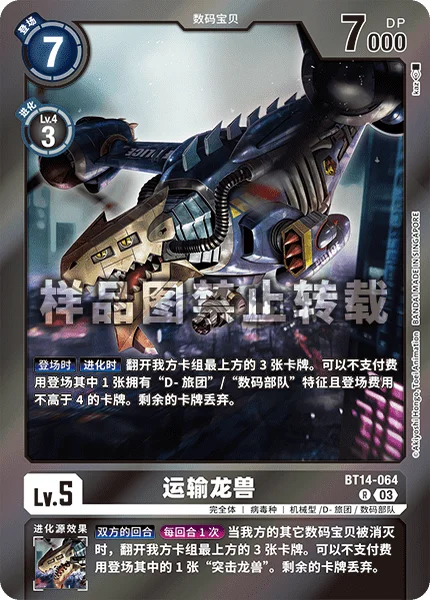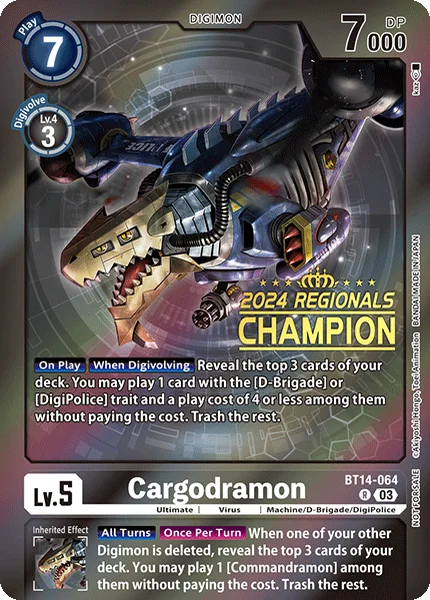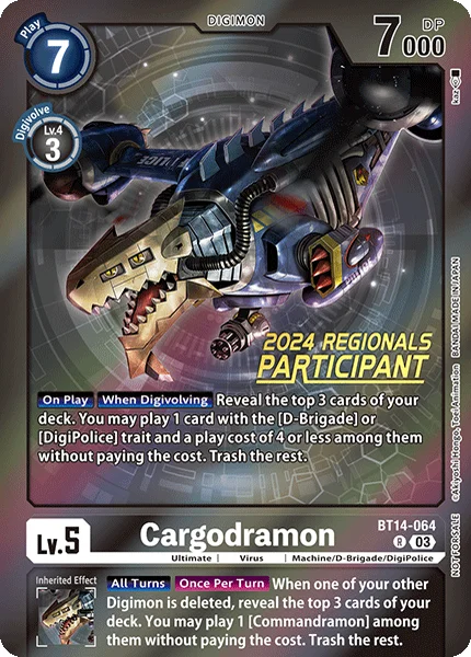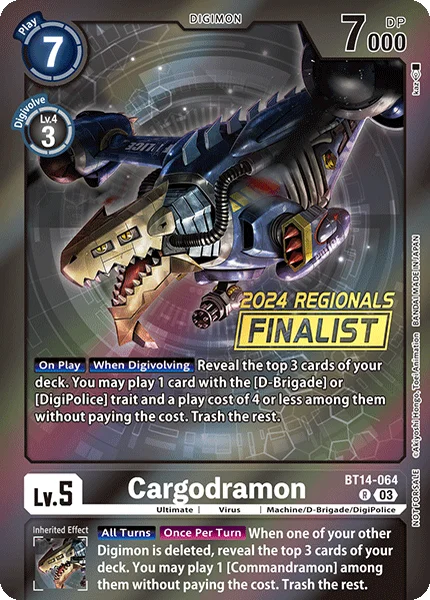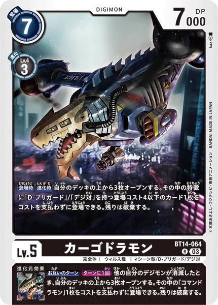 On PlayWhen Digivolving Reveal the top 3 cards of your deck. You may play 1 card with the [D-Brigade] or [DigiPolice] trait and a play cost of 4 or less among them without paying the cost. Trash the rest.
