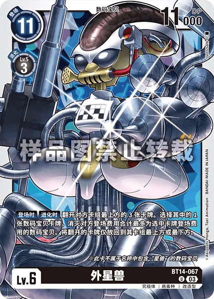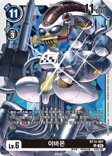 On PlayWhen Digivolving Your opponent reveals the top 3 cards of their deck. Choose 1 Digimon card among them, and delete up to its play cost's total worth of your opponent's Digimon. Return the revealed cards to the top or bottom of the deck.