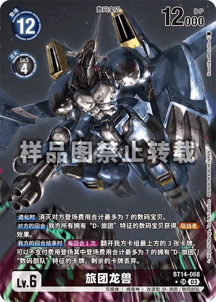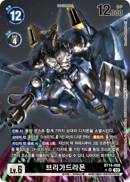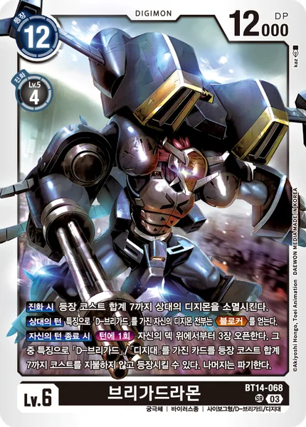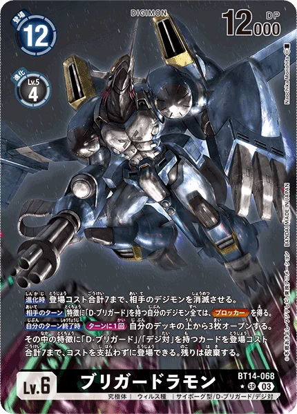 Opponent's Turn All of your Digimon with the [D-Brigade] trait gain Blocker. End of Your TurnOnce Per Turn Reveal the top 3 cards of your deck. You may play up to 7 play cost's total worth of cards with the [D-Brigade] or [DigiPolice] trait among them without paying the costs. Trash the rest.