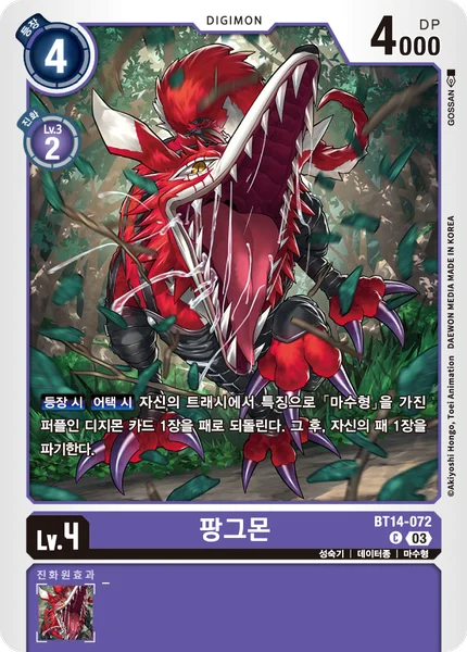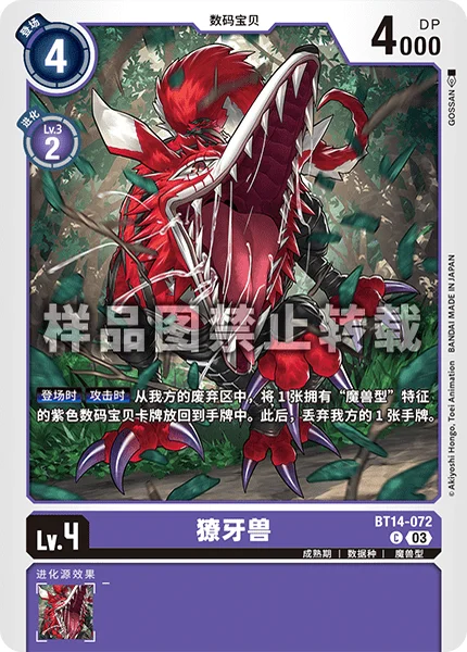 On PlayWhen Attacking Return 1 purple Digimon card with the [Dark Animal] trait from your trash to the hand. Then, trash 1 card in your hand.
