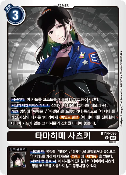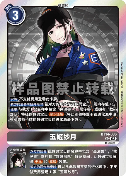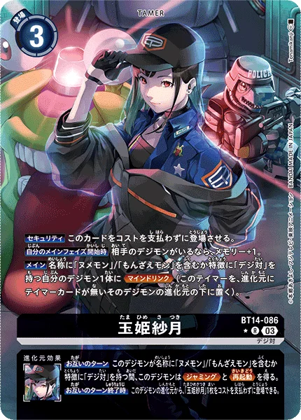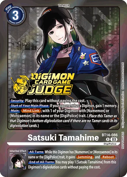 All Turns While this Digimon has [Numemon] or [Monzaemon] in its name, or the [DigiPolice] trait, it gains Jamming and Reboot. End of All Turns You may play 1 [Satsuki Tamahime] from this Digimon's digivolution cards without paying the cost.