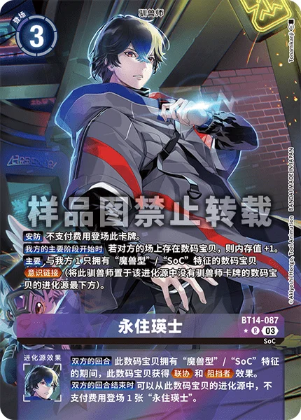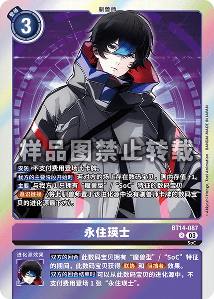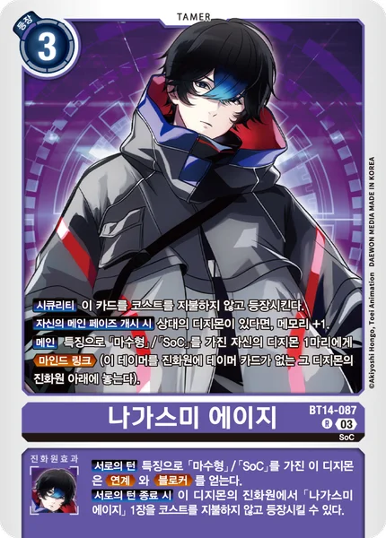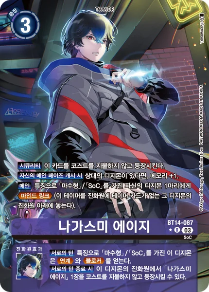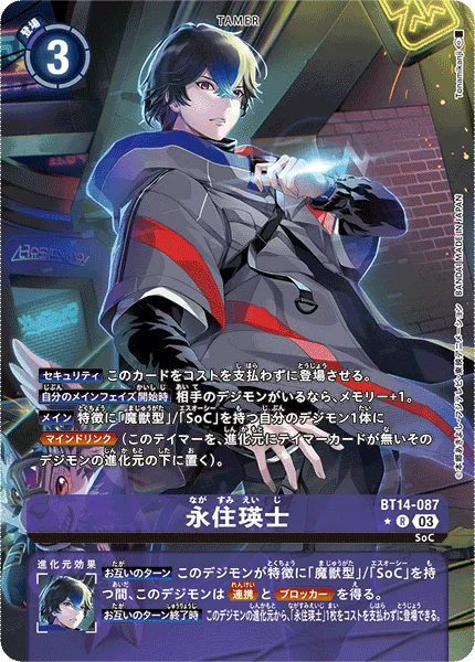 All Turns While this Digimon has the [Dark Animal] or [SoC] trait, it gains Alliance and Blocker. End of All Turns You may play 1 [Eiji Nagasumi] from this Digimon's digivolution cards without paying the cost.