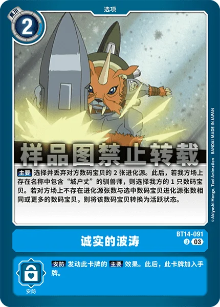 ,if you have a Tamer with [Joe Kido] in its name, choose 1 of your Digimon. If your opponent has no Digimon with as many or more digivolution cardsthanas the chosen Digimon, unsuspend it.- Notes