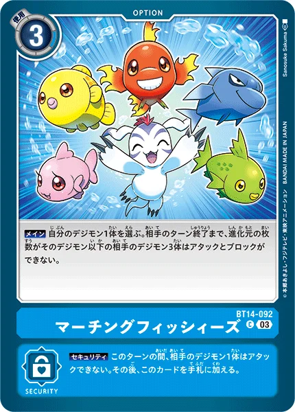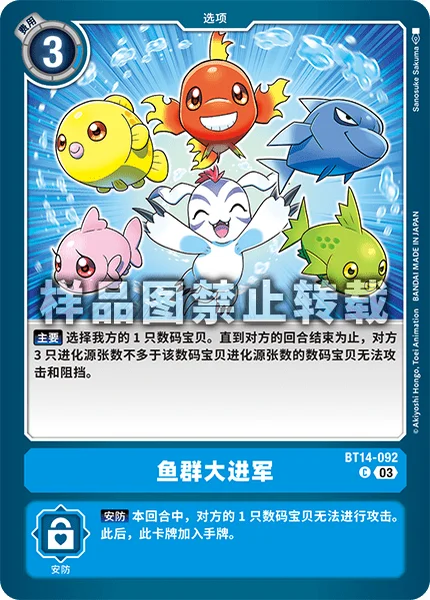 Main Choose 1 of your Digimon. Until the end of your opponent's turn, 3 of your opponent's Digimon with as many or fewer digivolution cards as that Digimon can't attack or block.