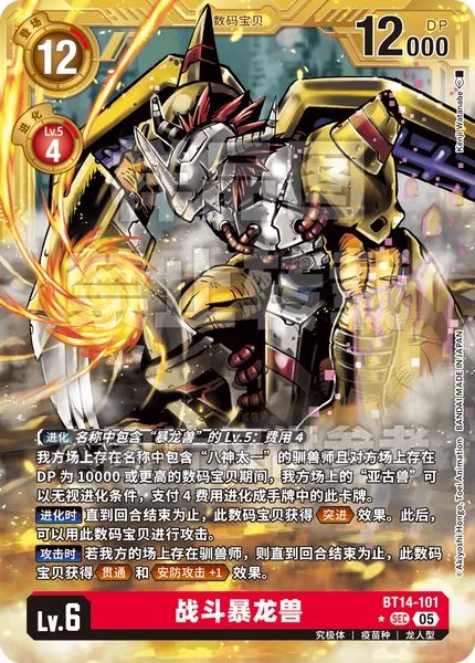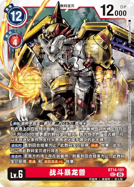 While you have a Tamer with [Tai Kamiya] in its name and your opponent has a Digimon with 10000 DP or more, one of your [Agumon] may digivolve into this card in your hand for a digivolution cost of 4, ignoring digivolution requirements.