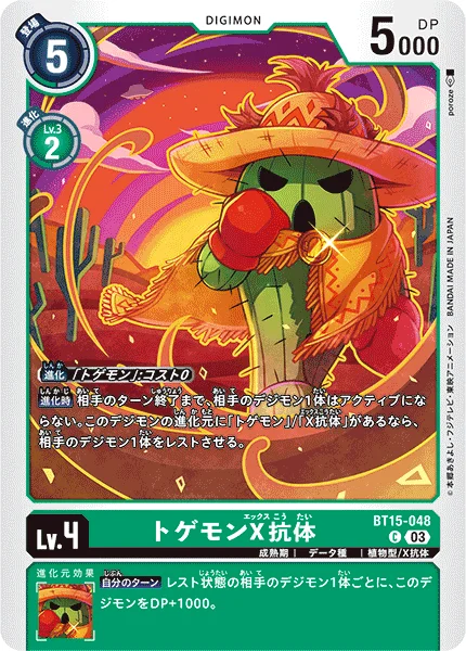 When Digivolving 1 of your opponent's Digimon can't unsuspend until the end of their turn. If [Togemon] or [X Antibody] is in this Digimon's digivolution cards, suspend 1 of your opponent's Digimon.
