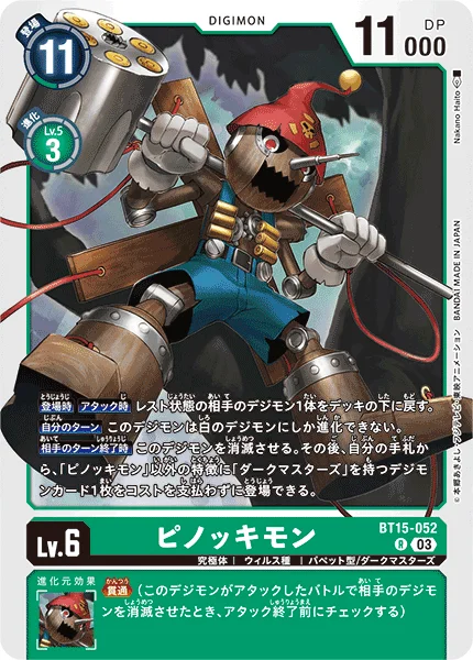 End of Opponent's Turn Delete this Digimon. Then, you may play 1 Digimon card with the [Dark Masters] trait, other than [Puppetmon], from your hand without paying the cost.