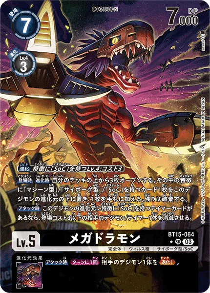 On Play When Digivolving Reveal the top 3 cards of your deck. Among them, place 1 [Machine], [Cyborg] or [SoC] trait card as this Digimon's bottom digivolution card, and add 1 such card to the hand. Trash the rest.