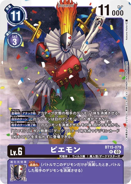 End of Opponent's Turn Delete this Digimon. Then, you may play 1 Digimon card with the [Dark Masters] trait, other than [Piedmon], from your hand without paying the cost.