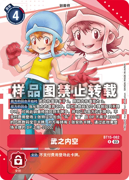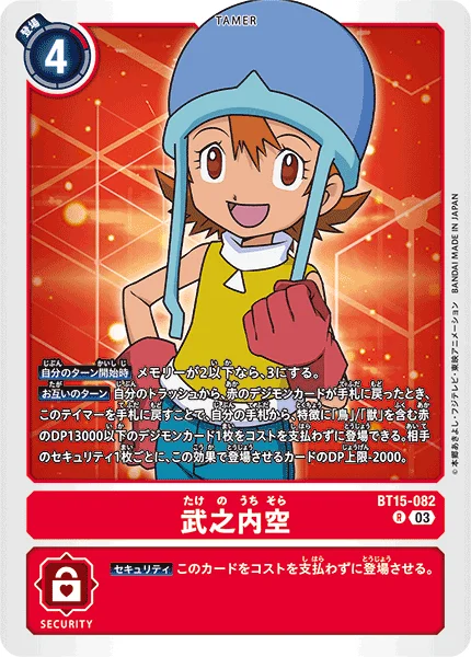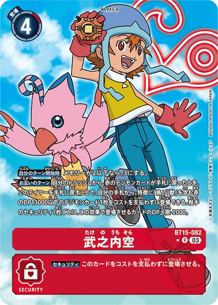 All Turns When a red Digimon card returns from your trash to the hand, by returning this Tamer to the hand, you may play 1 13000 DP or lower red Digimon card with [Avian], [Bird], [Beast], [Animal] or [Sovereign], other than [Sea Animal], in one of its traits from your hand without paying the cost. For each of your opponent's security cards, remove 2000 from this effect's playable card's DP maximum.