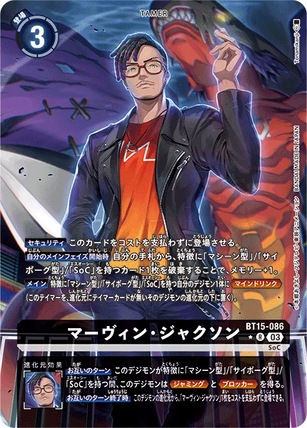 All Turns While this Digimon has the [Machine], [Cyborg] or [SoC] trait, it gains Jamming and Blocker. End of All Turns You may play 1 [Marvin Jackson] from this Digimon's digivolution cards without paying the cost.