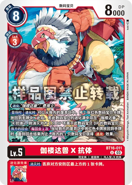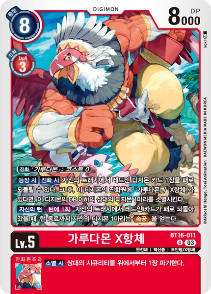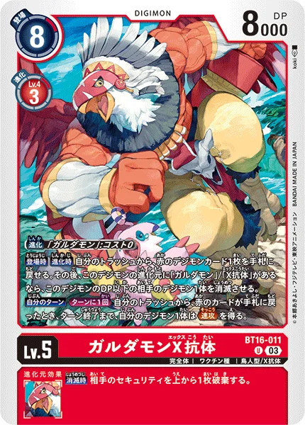 On Play When Digivolving You may return 1 red Digimon card from your trash to the hand. Then, if [Garudamon] or [X Antibody] is in this Digimon's digivolution cards, delete 1 of your opponent's Digimon with as much or less DP as this Digimon.