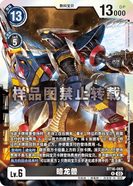 When this card would be played, if there is a Digimon with the [Boss] trait, reduce the play cost by 6. By returning 6 cards with the [D-Brigade] trait from your trash to the top of the deck, reduce the play cost by 6.