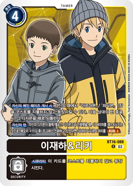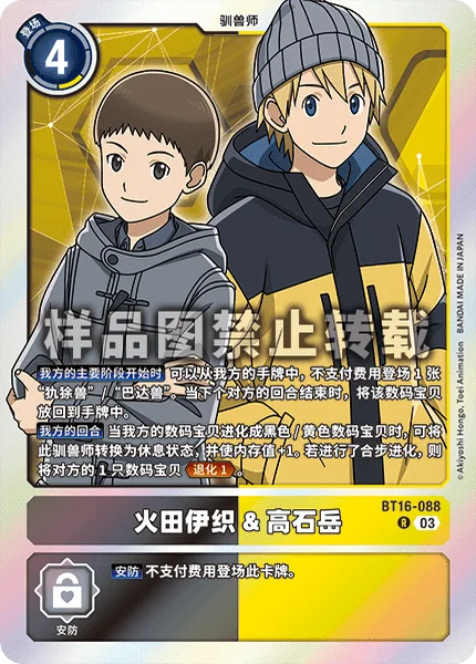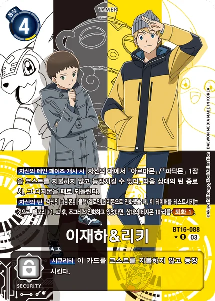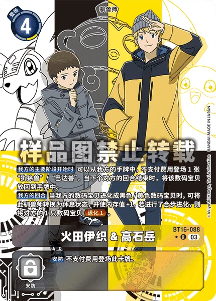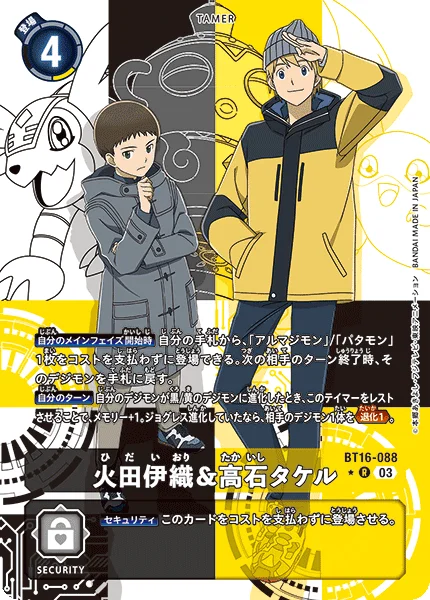 Your Turn When one of your Digimon digivolves into a black or yellow Digimon, by suspending this Tamer, gain 1 memory. If DNA digivolving, De-Digivolve 1 1 of your opponent's Digimon.