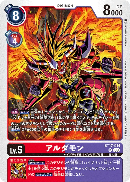 Hand Main By placing 1 [Agunimon] and 1 [BurningGreymon] from your trash under 1 of your [Takuya Kanbara]s, digivolve it into this card as if that card is a level 4 red Digimon for a digivolution cost of 3.