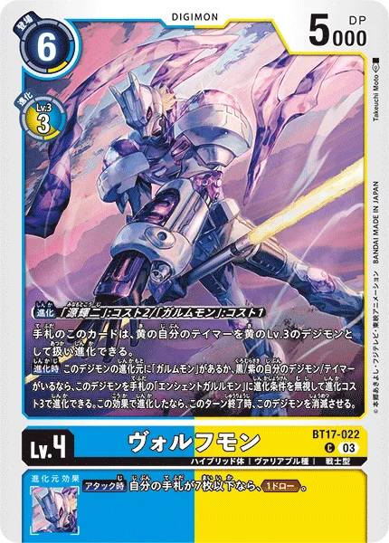 This card in the hand may digivolve onto any of your yellow Tamers as if onto a level 3 yellow Digimon.
