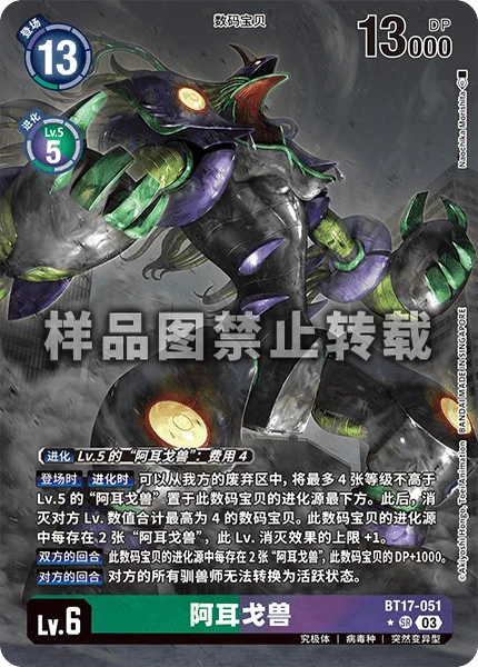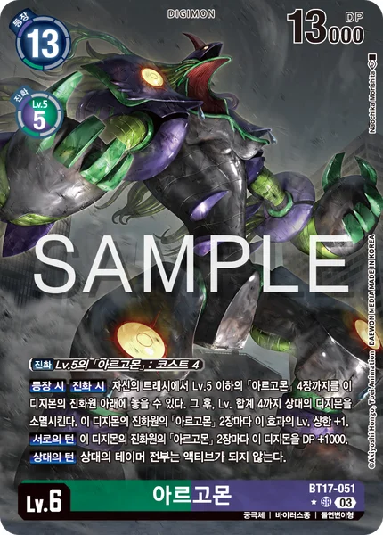 On Play When Digivolving You may place up to 4 level 5 or lower [Argomon] from your trash as this Digimon's bottom digivolution cards. Then, delete up to 4 levels' total worth of your opponent's Digimon. For every 2 [Argomon] in this Digimon's digivolution cards, add 1 to this level deletion effect's maximum.