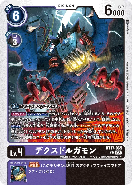 When Digivolving Trash 1 card in your hand. Then, Draw 1. If [Dorugamon] is in this Digimon's digivolution cards or this digivolved from the trash, delete 1 of your opponent's Digimon with a play cost of 4 or less instead.