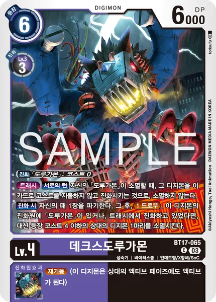 Trash All Turns When one of your [Dorugamon] would be deleted, by digivolving it into this card without paying the cost, prevent that deletion.