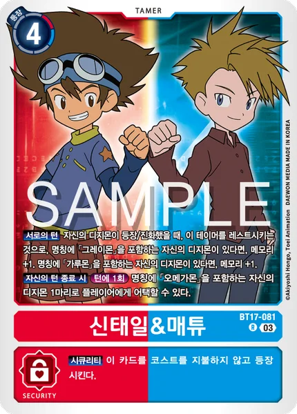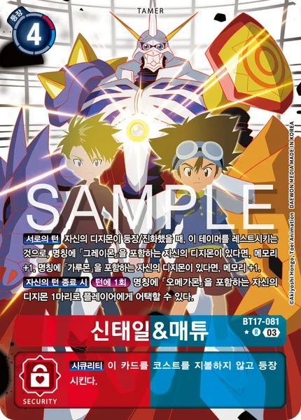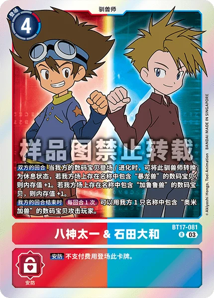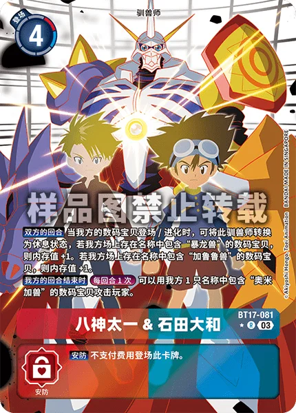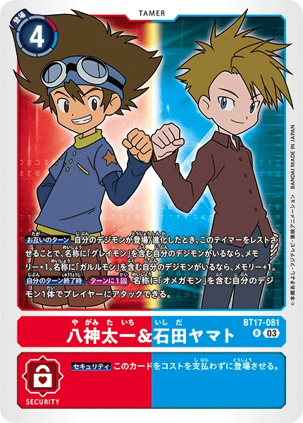 All Turns When one of your Digimon is played or digivolves, by suspending this Tamer, if you have a Digimon with [Greymon] in its name, gain 1 memory. If you have one with [Garurumon] in its name, gain 1 memory.