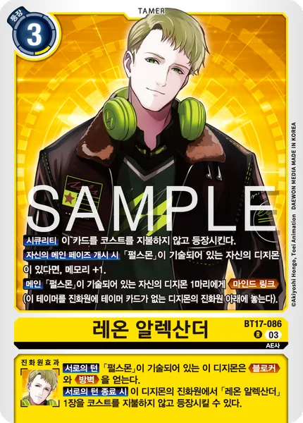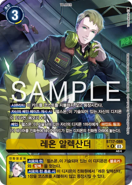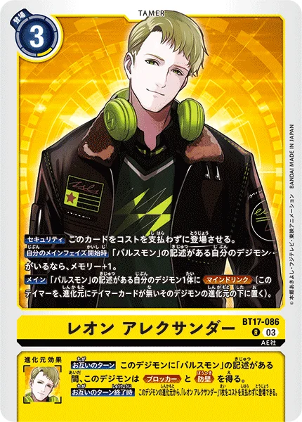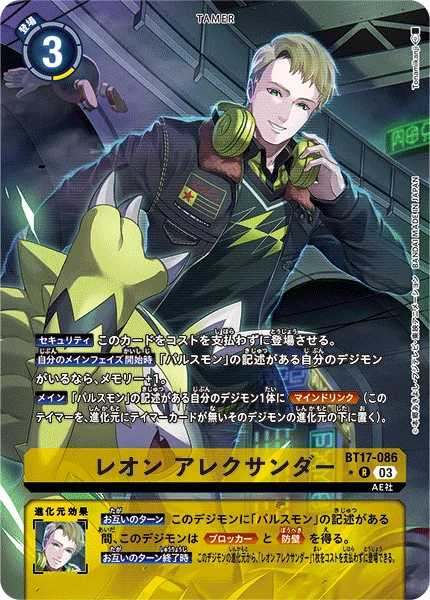 All Turns While this Digimon has [Pulsemon] in its text, it gains Blocker and Barrier. End of All Turns You may play 1 [Leon Alexander] from this Digimon's digivolution cards without paying the cost.