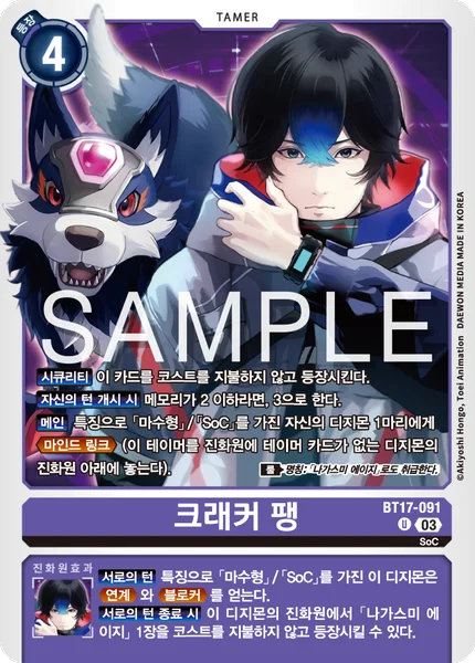 All Turns While this Digimon has the [Dark Animal] or [SoC] trait, it gains Alliance and Blocker. End of All Turns You may play 1 [Eiji Nagasumi] from this Digimon's digivolution cards without paying the cost.