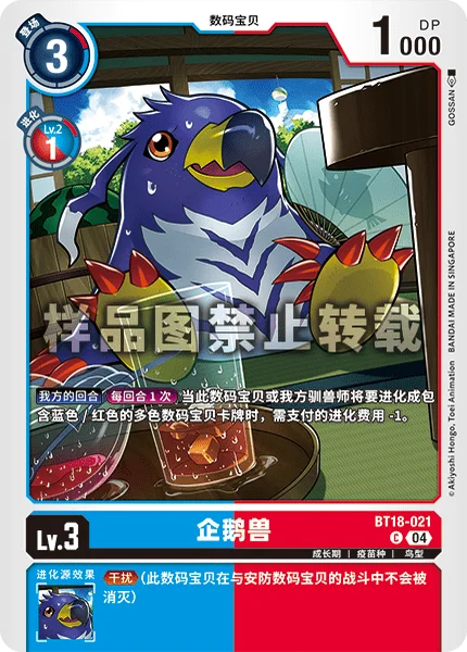 Your Turn Once Per Turn When this Digimon or any of your Tamers would digivolve into multicolor blue or red Digimon cards, reduce the digivolution costs by 1.