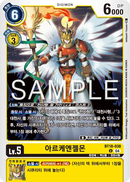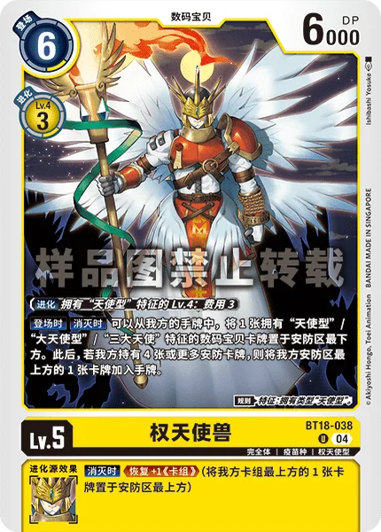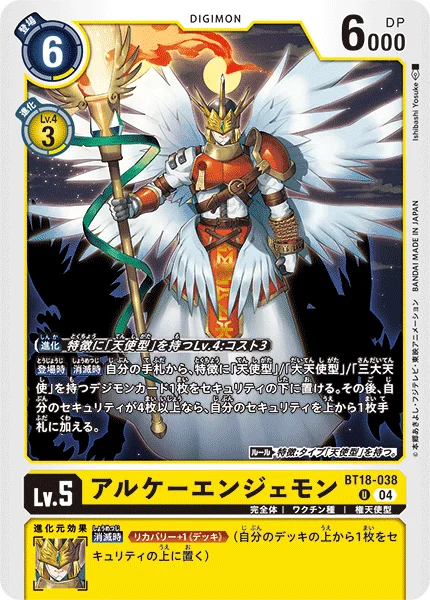 On Play On Deletion You may place 1 Digimon card with the [Angel], [Archangel] or [Three Great Angels] trait from your hand as the bottom security card. Then, if you have 4 or more security cards, add your top security card to the hand. Rule Trait: Has [Angel] Type.