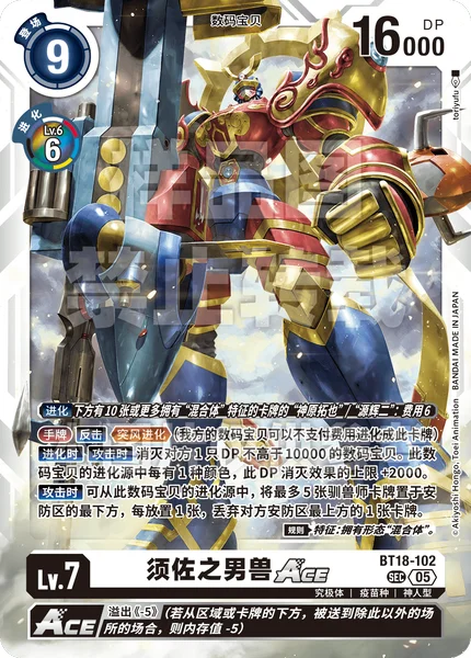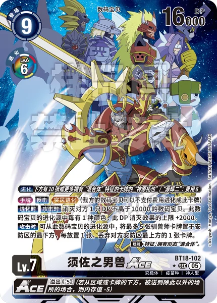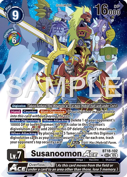When Attacking By placing up to 5 Tamer cards from this Digimon's digivolution cards as your bottom security cards, for each one, trash your opponent's top security card. Rule Trait: Has [Hybrid] Form.