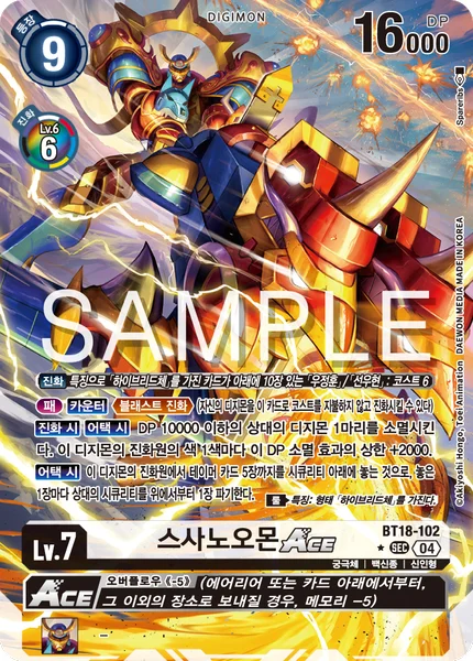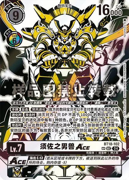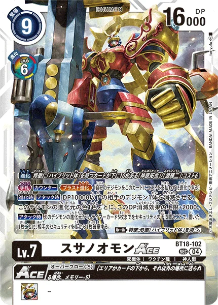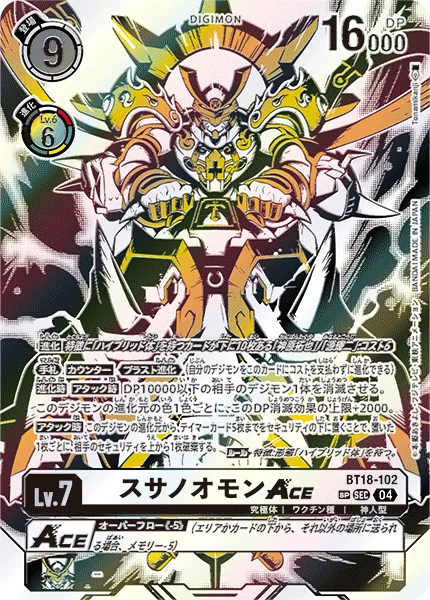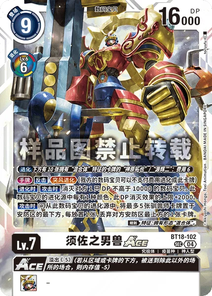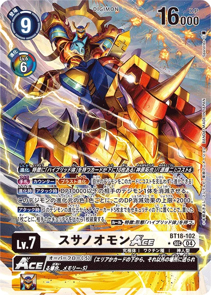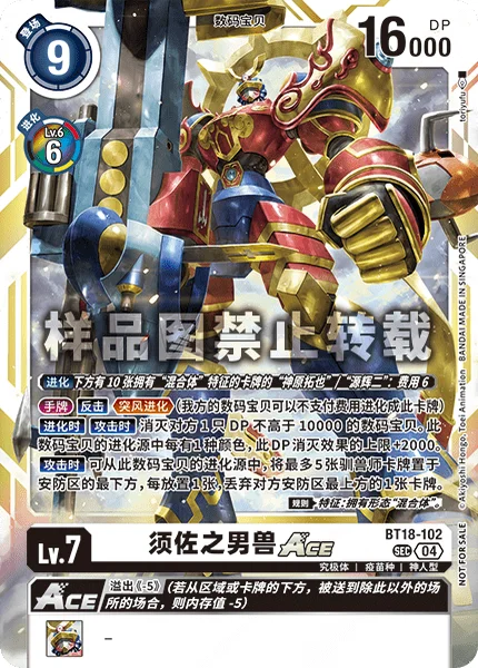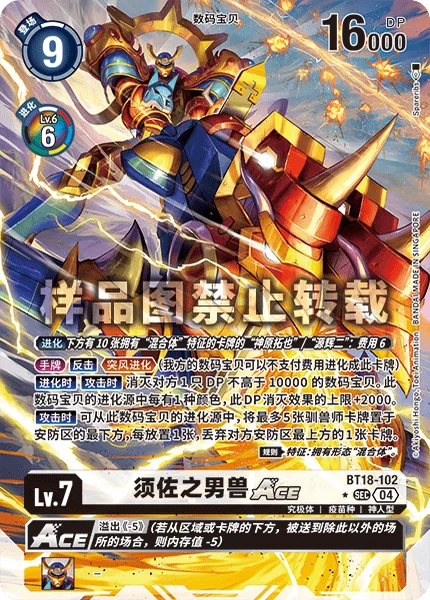 This card can digivolve from [Takuya Kanbara] with 10 [Hybrid] trait cards under it or [Koji Minamoto] with 10 [Hybrid] trait cards under it for a cost of 6.