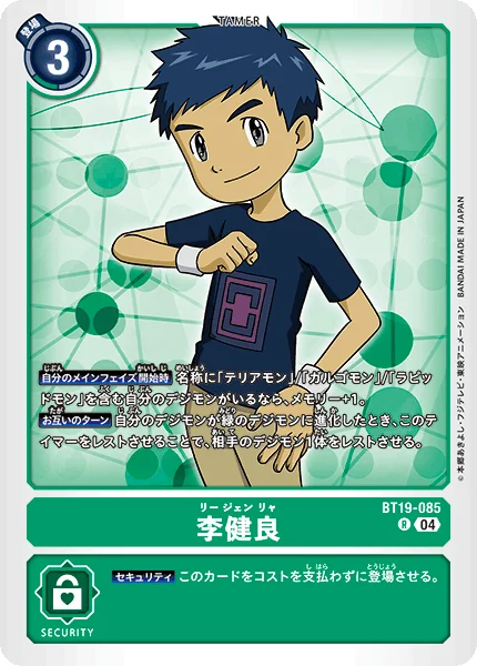 All Turns When any of your Digimon digivolve into a green Digimon, by suspending this Tamer, suspend 1 of your opponent's Digimon.