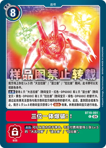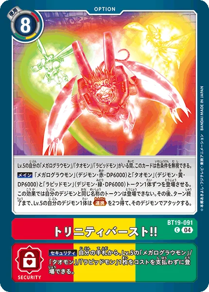 Main Play 1 [WarGrowlmon] Token (Digimon/red/6000 DP), 1 [Taomon] Token (Digimon/yellow/6000 DP) and 1 [Rapidmon] Token (Digimon/green/6000 DP). This effect can't play Tokens with the same names as your Digimon. Then, 1 of your level 5 Digimon gains Alliance twice for the turn and attacks.