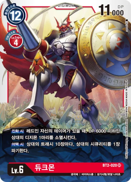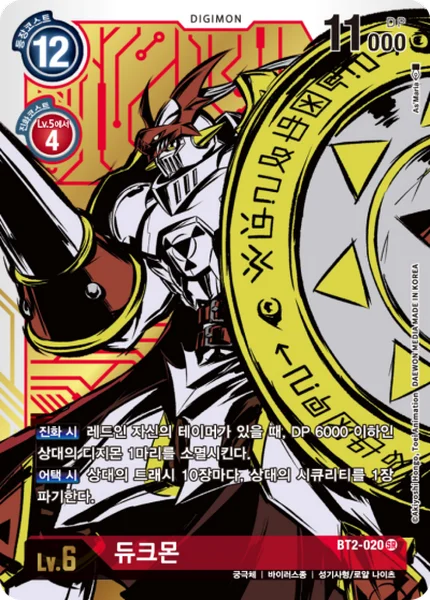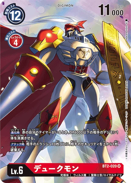 When Digivolving If you have a red Tamer in play, delete 1 of your opponent's Digimon with 6000 DP or less.When Attacking Trash 1 of your opponent's security cards for every 10 cards in their trash.