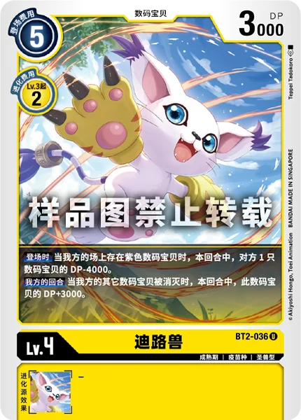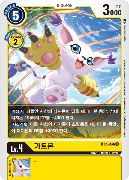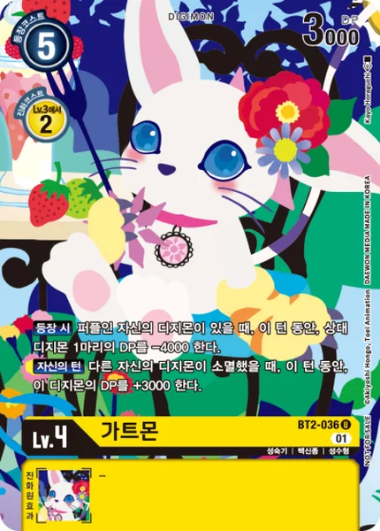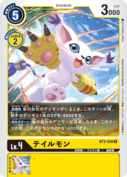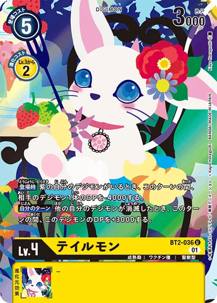On Play If you have a purple Digimon in play, 1 of your opponent's Digimon gets -4000 DP for the turn.Your Turn When one of your other Digimon is deleted, this Digimon gets +3000 DP for the turn.