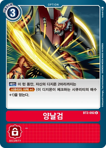Main Up to 2 of your Digimon gain Security Attack +1 (This Digimon checks 1 additional security card) for the turn.