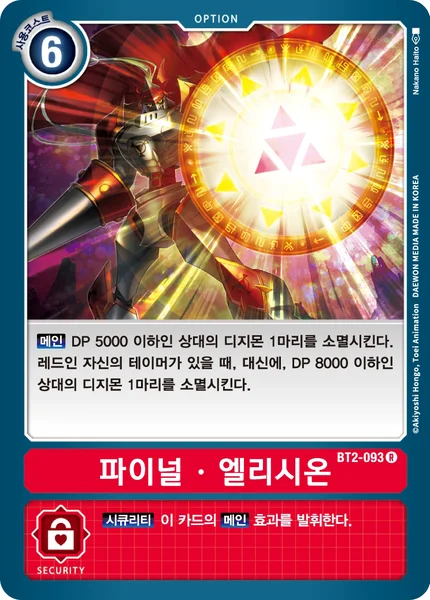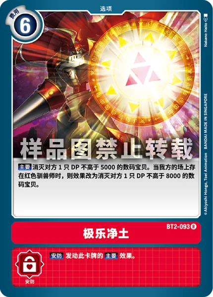Main Delete 1 of your opponent's Digimon with 5000 DP or less. If you have a red Tamer in play, delete 1 of your opponent's Digimon with 8000 DP or less instead.