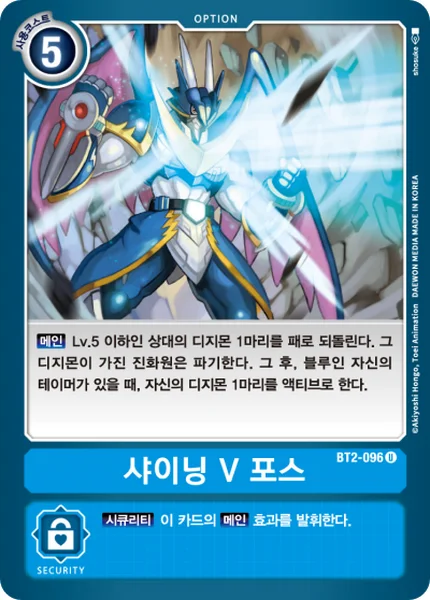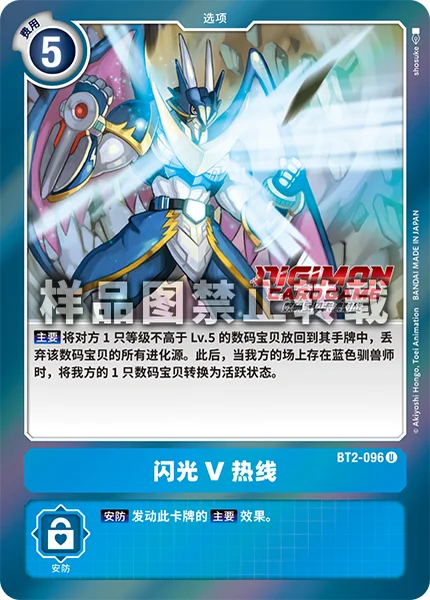Main Return 1 of your opponent's level 5 or lower Digimon to their hand. (Trash all of the digivolution cards of that Digimon.) Then, if you have a blue Tamer in play, unsuspend 1 of your Digimon.