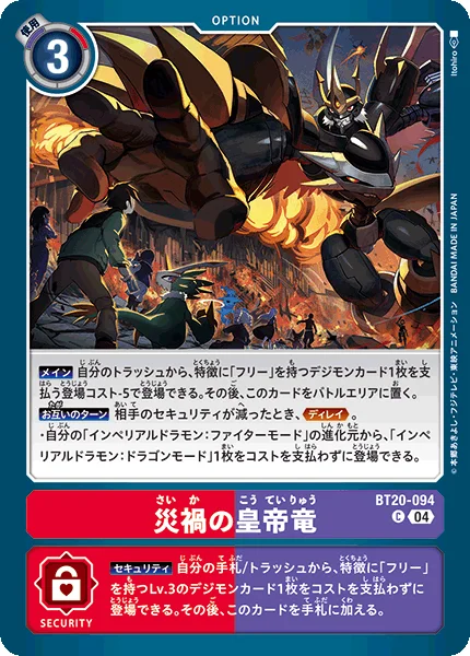 All Turns When your opponent's security stack is removed from, Delay. ・You may play 1 [Imperialdramon: Dragon Mode] from any of your [Imperialdramon: Fighter Mode]'s digivolution cards without paying the cost.