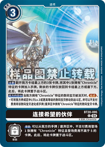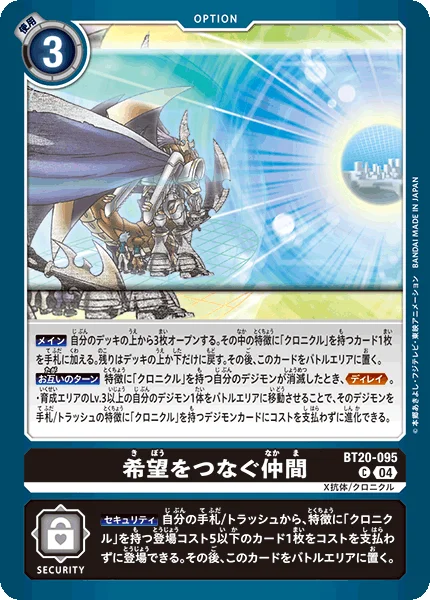 All Turns When any of your [Chronicle] trait Digimon are deleted, Delay. ・By moving your level 3 or higher [Chronicle] trait Digimon from the breeding area to the battle area, it may digivolve into a [Chronicle] trait Digimon card in the hand or trash without paying the cost.
