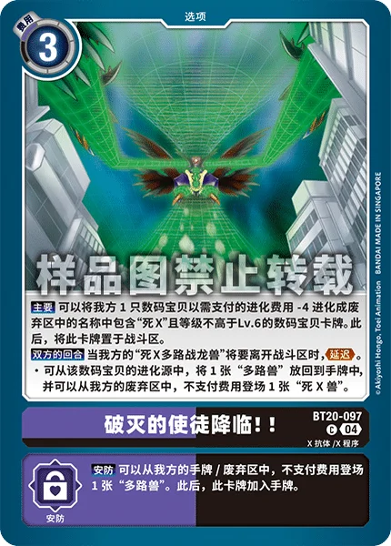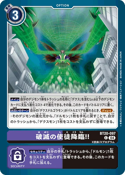 Main 1 of your Digimon may digivolve into a level 6 or lower Digimon card with [Dex] or [DeathX] in its name in the trash with the digivolution cost reduced by 4. Then, place this card in the battle area.