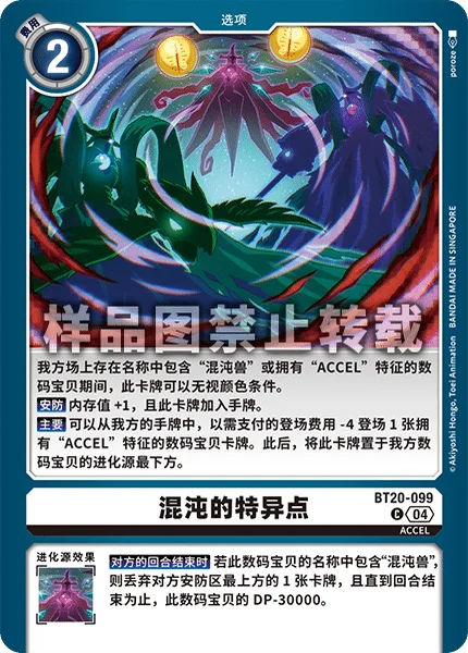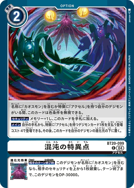 While you have a Digimon with [Chaosmon] in its name or the [ACCEL] trait, you may ignore this card's color requirements.