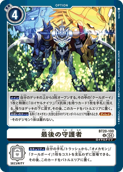 Security You may play 1 [Omekamon] or [Cool Boy] from your hand or trash without paying the cost. Then, place this card in the battle area.