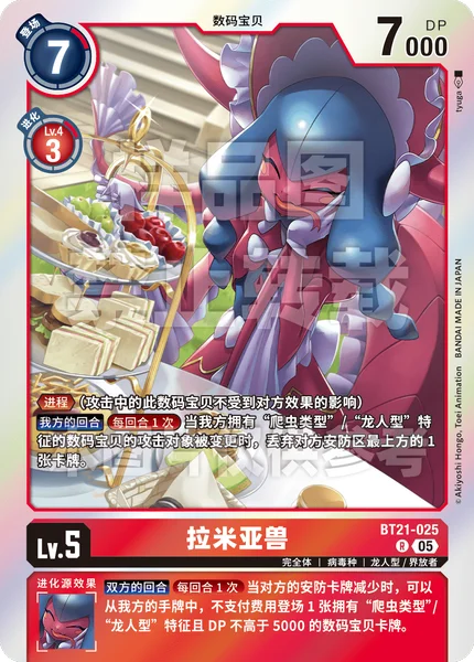 All Turns Once Per Turn When your opponent's security is removed from, you may play 1 [Reptile] or [Dragonkin] trait Digimon card with 5000 DP or less from your hand without paying the cost.