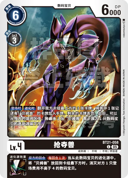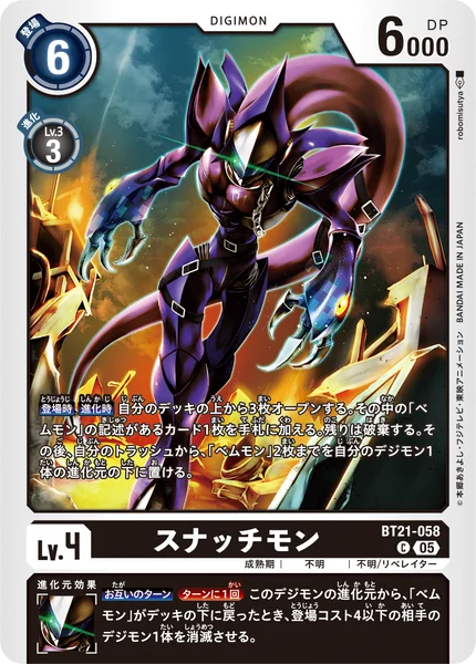 On Play When Digivolving Reveal the top 3 cards of your deck. Add 1 card with [Vemmon] in its text among them to the hand. Trash the rest. Then, you may place up to 2 [Vemmon] from your trash as 1 of your Digimon's bottom digivolution cards.
