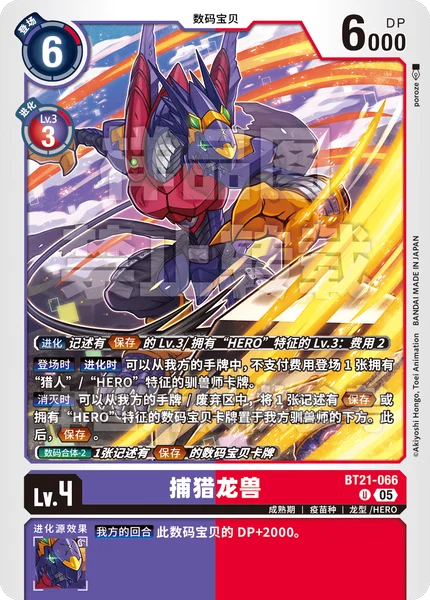 On Play When Digivolving You may play 1 Tamer card with the [Hunter] or [Hero] trait from your hand without paying the cost.