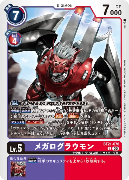 When Attacking Once Per Turn This Digimon may digivolve into a Digimon card with [Megidramon] or [ChaosGallantmon] in its name in the hand. For every 10 total cards in both players' trashes, reduce this effect's digivolution cost by 1.