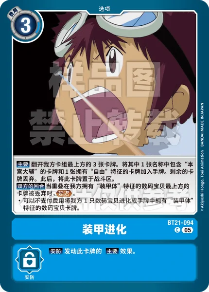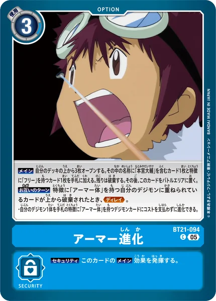 All Turns When the top stacked card of any your [Armor Form] trait Digimon is trashed, Delay. ・1 of your Digimon may digivolve into a Digimon card with the [Armor Form] trait in the hand without paying the cost.